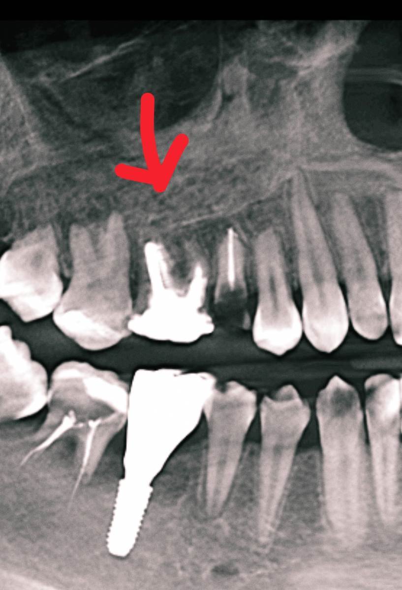 16 зуб эндодонтически лечен. Коронковая часть восстановлена рентгеноконтрастным материалом.